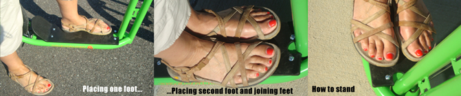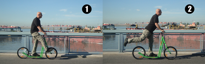 A: Begin by lifting your kicking foot forward, in front of you. Then swing your foot back, pushing the ground as you swing through. The higher you lift your foot forward, the more momentum you will be able to gain. Repeat the kicking several times to increase your speed, then join your feet together on the platform, relax and enjoy gliding. When you begin to slow down, begin kicking or pushing off the ground again with either leg. Choose whichever leg is most comfortable or switch legs when one becomes tired and to get a symmetrical workout.